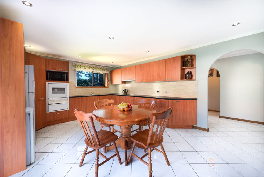 Showcasing a spacious wooden modern style kitchen with plenty of cabinetry storage, bench space combining with the dining area. Convenient sliding doors which open up to the massive back yard which has Granny Flat Potential (STCA).