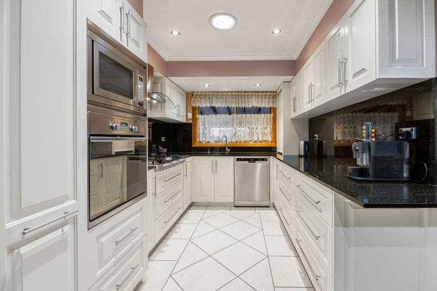 Showcasing a Spacious contemporary kitchen with 6 gas cook top, qaulity stainless steel appliances, dishwasher, marble bench-tops and black sleek marble splash back.