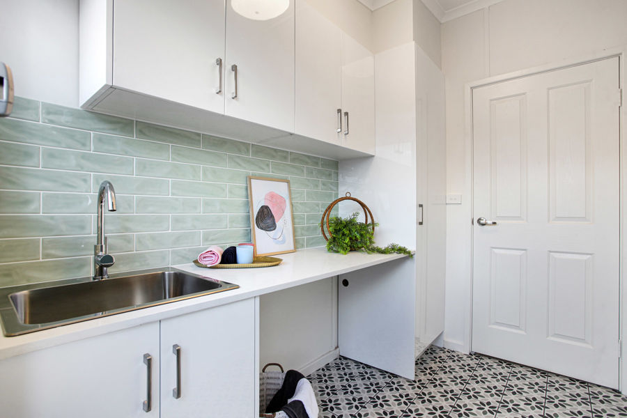 This home has attention to detail such as the modern design laundry room with brand new built in cabinetry for storage space, elegant splash back tiling creating a Hampton style design and colour pallets reflected throughout the home emulating a warm ambience feel from the kitchen to the laundry and throughout.