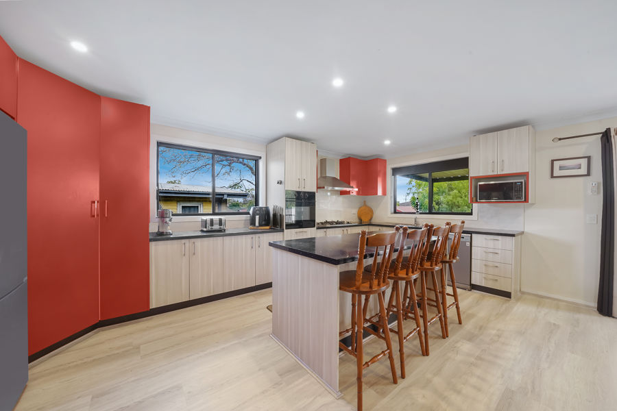 The modern kitchen oversees the open dining and living area that entails huge glass windows and sliding doors inviting in the natural sunlight providing a warm light filled ambience capturing the views of the massive outdoor undercover deck area, perfect for entertaining family and guest. An entertainers Delight!